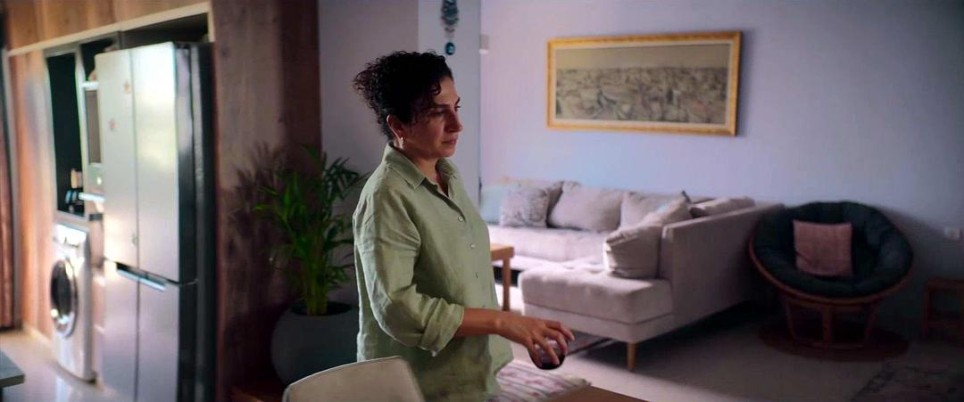 作为一部近些年来少有的全程在巴勒斯坦实景拍摄的影片,本片非常难得地向我们呈现出巴勒斯坦社会生活方方面面诸多真实的细节。由于巴解组织在处理和以色列关系的问题上采取了温和务实的态度,西岸地区的巴勒斯坦人得以生活在较为平和安定和富足的社会环境中。影片里一共出现了四个家庭的场景:姐姐家、父亲家、舅舅家、儿子的同学家。这些家庭呈现出的巴勒斯坦人的生活条件令人吃惊,比起国内北上广等一线城市的中产阶级家庭毫不逊色。当姐姐向儿子同学的母亲提到儿子开走另一个同学父亲的大奔时,同学的母亲竟然说“现在哪个家里没有大奔呢?”(见下面截图)。姐姐家位于一个整齐的居民社区,只是这里一个寻常单元里的普通一户,楼道整洁干净,就是这样的普通一户,家里有宽敞的客厅和厨房,至少三个卧室(两个男孩各一间), 滚筒洗衣机,对开门大冰箱,家里还有大型SUV。妹妹只是一个在美容院打工的单身女性,也有属于自己的一辆小轿车。她们的父亲则是住在独门独户的二层洋房里,老头子自己住二楼,把一楼出租给另一个老女人。